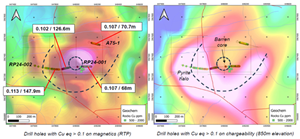 In 2024 two drill holes were completed on the northern geophysical target from a single setup, both intersecting anomalous to low-grade Cu-Mo porphyry mineralization from surface, and at depths >400m in RP24-001. Mineralization in both holes is hosted in three distinct phases of porphyritic intrusions with potassic to phyllic alteration and multistage veining (e.g., magnetite-chalcopyrite; quartz-chalcopyrite-molybdenite, pyrite-chalcopyrite with sericite haloes).